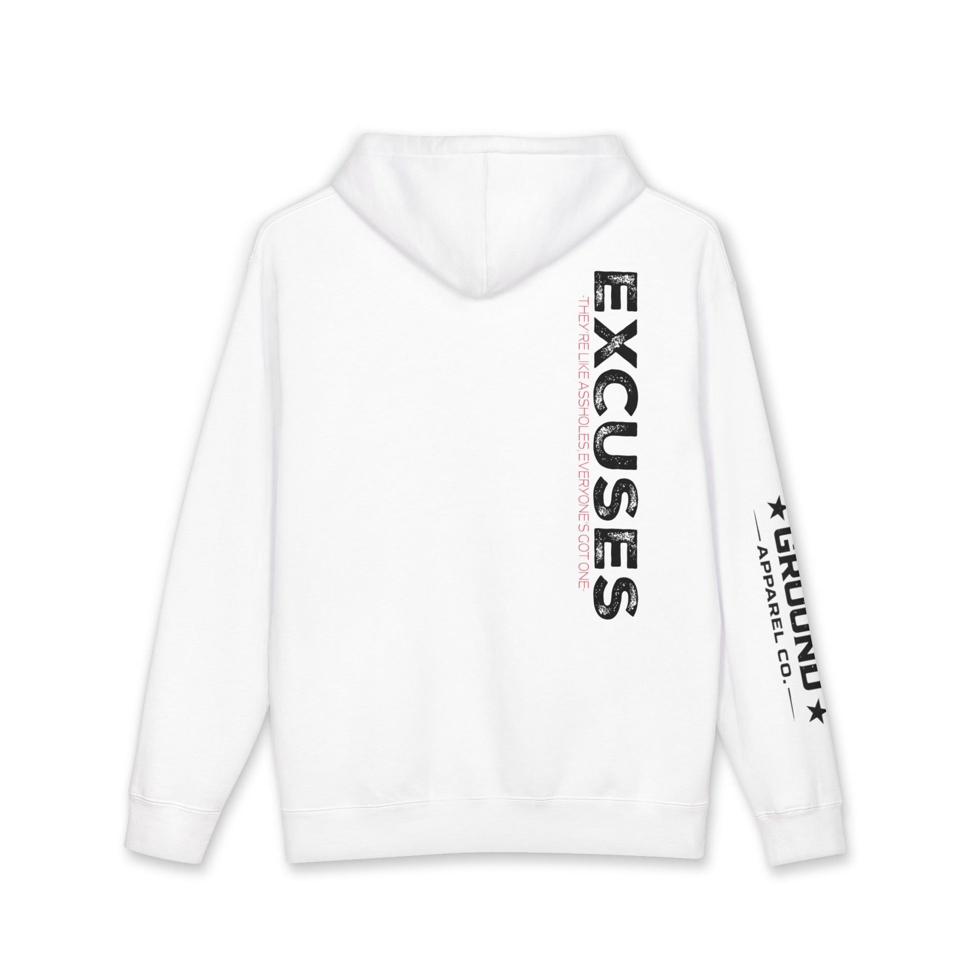 Excuses Hoodie — White Graphic Pullover with Sleeve & Chest Logo