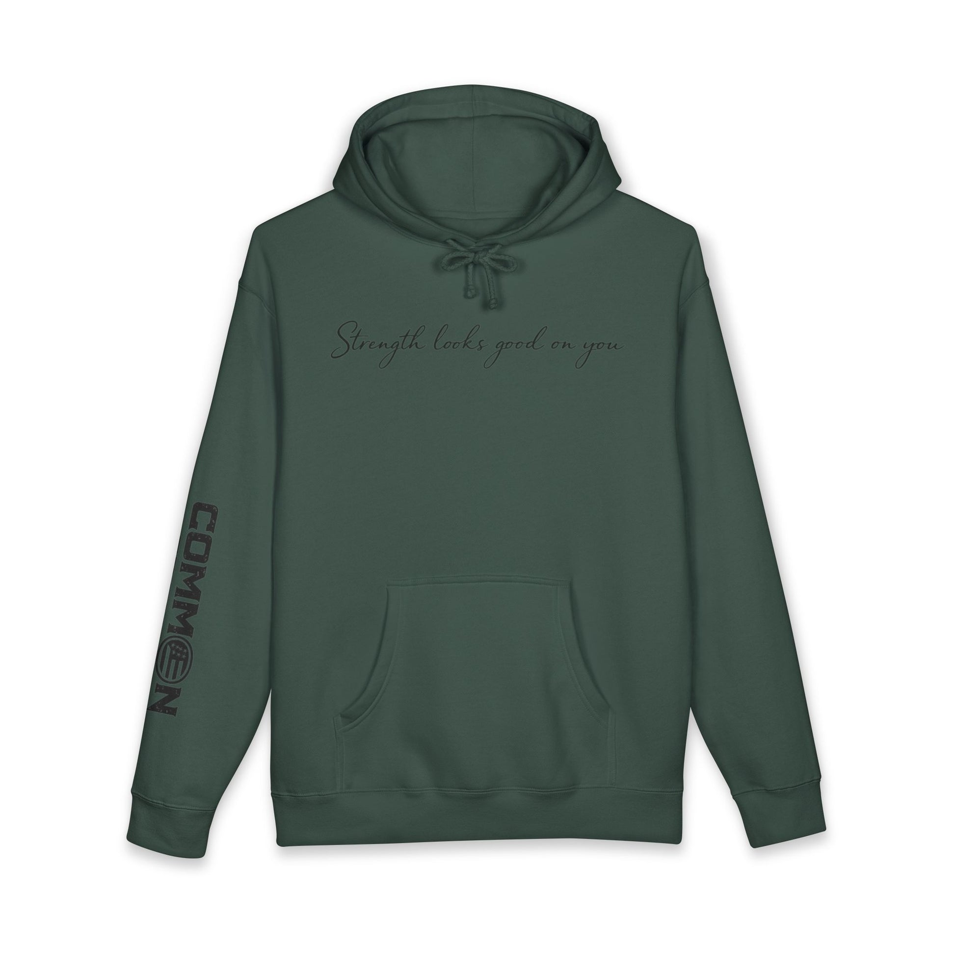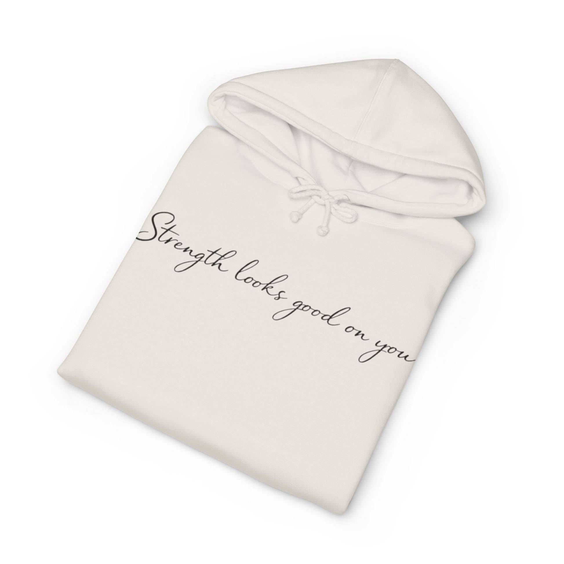 Hoodie — “Strength Looks Good on You” Minimal Script Hoodie with Sleeve Branding