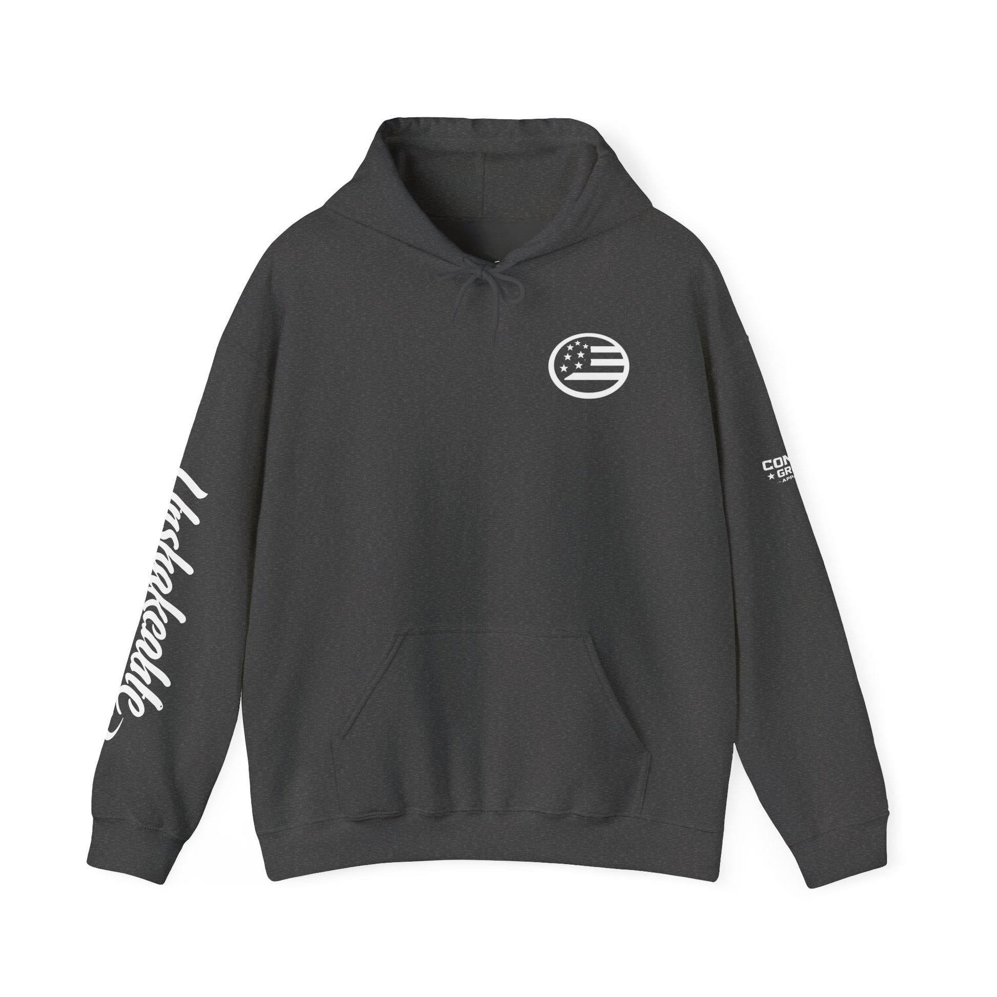 This black hoodie brings quiet confidence to everyday wear. The clean, minimalist front features a small circular emblem with a stripped flag motif, while bold script runs down one sleeve and a compact wordmark sits near the opposite wrist — subtle graphics that read modern and intentional. The double-lined hood and color-matched drawcord create a finished, street-ready silhouette. Wear it on chilly mornings, long drives, or layered for late-night meetups; it stays soft, warm, and low-key while making a clear visual statement. Designed for adults who prefer refined, graphic-driven pieces that blend comfort with a bit of edge.